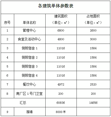 采購項(xiàng)目內(nèi)容包括:管理中心、食堂及活動中心、倒班宿舍(暫定四棟)、餐飲中心、南廠區(qū)門衛(wèi)室、圍墻立面概念設(shè)計,各單體參數(shù)如下表:
