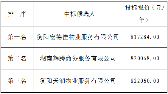 衡陽弘湘國有投資(控股)集團有限公司院內物業服務采購項目于2020年6月29日上午10時00分(北京時間)進行了比選開標、評標活動,評標委員會按照招標文件規定的評標辦法及原則進行評定,確定中標候選人如下: