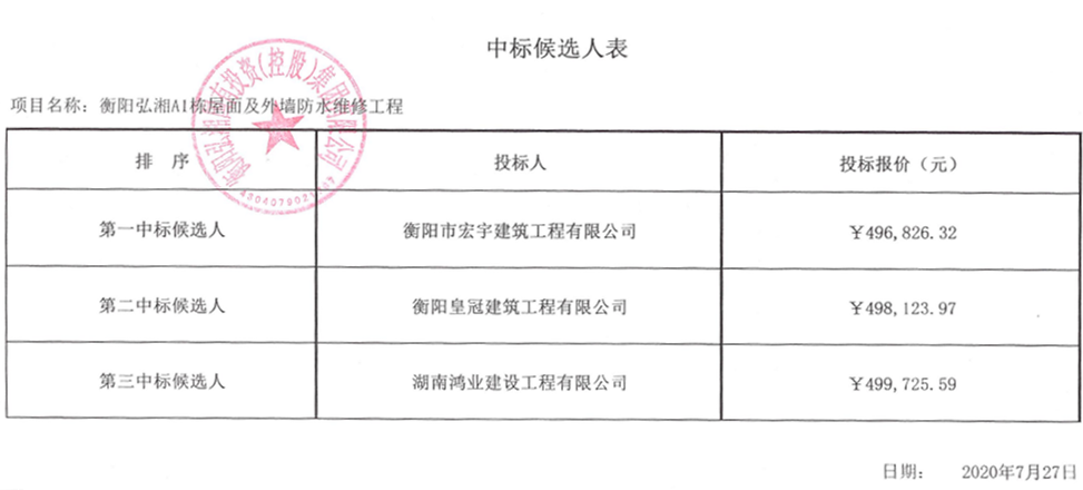 衡陽弘湘A1棟屋面及外墻防水維修工程中標候選人公布