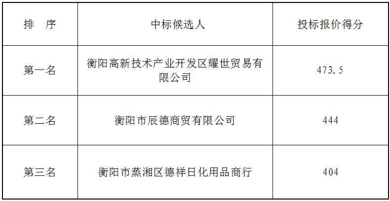 衡陽市衡府賓館有限公司(養(yǎng)正園)賓館客房用品(水果、副食類)于2021年1月27日下午2時30分(北京時間)進(jìn)行了比選開標(biāo)、評標(biāo)活動,評標(biāo)小組按照招標(biāo)公告規(guī)定的評標(biāo)辦法及原則進(jìn)行評定,確定中標(biāo)候選人如下: