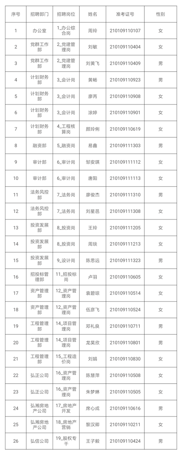 根據《衡陽弘湘國有投資(控股)集團有限公司2020年公開招聘員工公告》的規定,我司公開招聘員工按發布公告、報名、筆試、資格審查、面試、體檢、考察等程序,現確定26名擬聘用人員,并予以公示。
