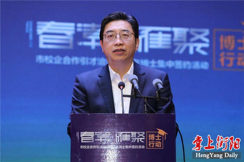 4月29日上午,“春潮·雁聚”博士行動——市校企合作引才洽談暨百名博士集中簽約活動在衡舉行,市委書記鄧群策在簽約儀式上向五湖四海的人才發出誠摯邀請,期望各位才俊用所學所得的智慧之光,照亮深入推進“一體兩翼”建設的騰飛之城,在衡陽這片高質量發展的熱土上成就輝煌事業、書寫精彩人生。市委副書記、市長朱健主持簽約儀式。