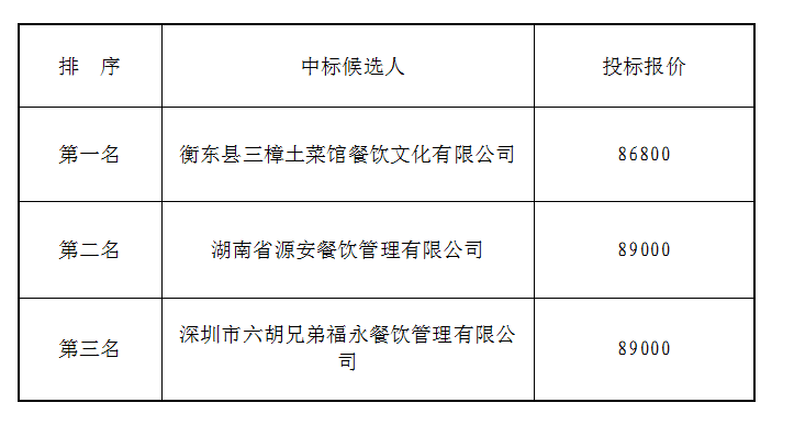 衡陽市衡府賓館有限公司(養(yǎng)正園)食堂勞務(wù)于2021年7月21日上午9時(shí)(北京時(shí)間)進(jìn)行了比選開標(biāo)、評(píng)標(biāo)活動(dòng),評(píng)標(biāo)小組按照招標(biāo)公告規(guī)定的評(píng)標(biāo)辦法及原則進(jìn)行評(píng)定,確定中標(biāo)候選人如下: