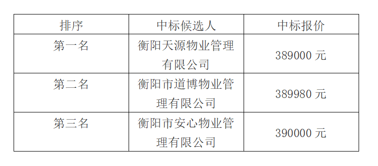 根據招標投標相關法律法規及招標文件的規定,衡拖棚戶區改造(一期)安置小區前期物業管理公司比選于2021年11月4日在弘湘寫字樓4樓會議室舉行開標、評標會,本項目采用“低價中標法”,現將中標候選人名單公示如下: